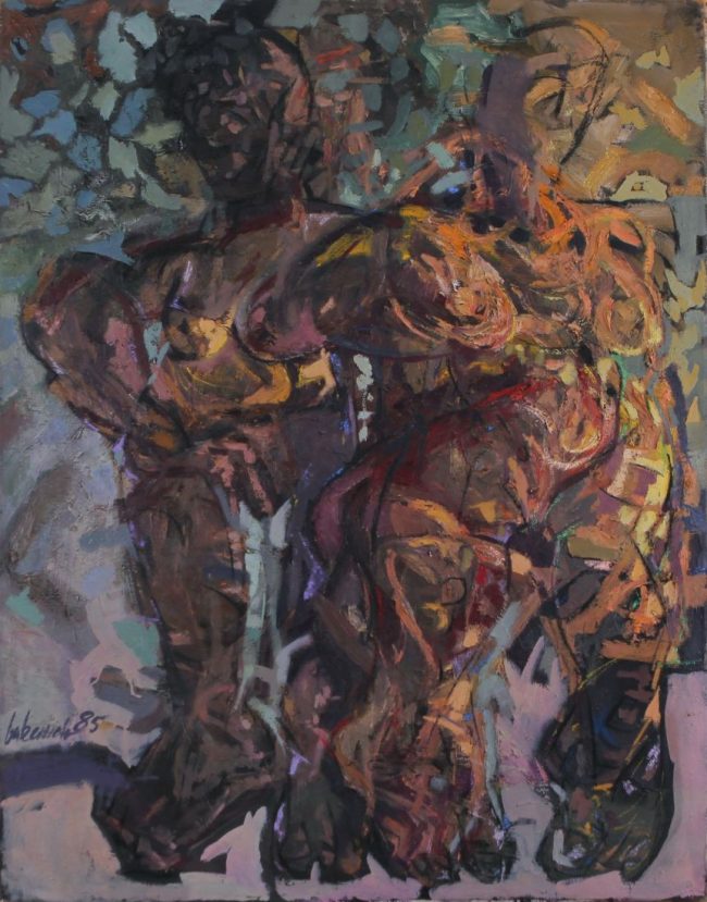Malerei Mann im Käfig | 1985 | Öl auf Leinwand | 130 x 100 cm Thomas Gatzemeier | o.T. (Zwei Frauen) | 1985 | Öl auf Leinwand | 100 x 130 cm Verbeugung | 1985 | Öl auf Leinwand | 110 x 130 cm Paar auf Bett | 1985 | Öl auf Leinwand | 110…